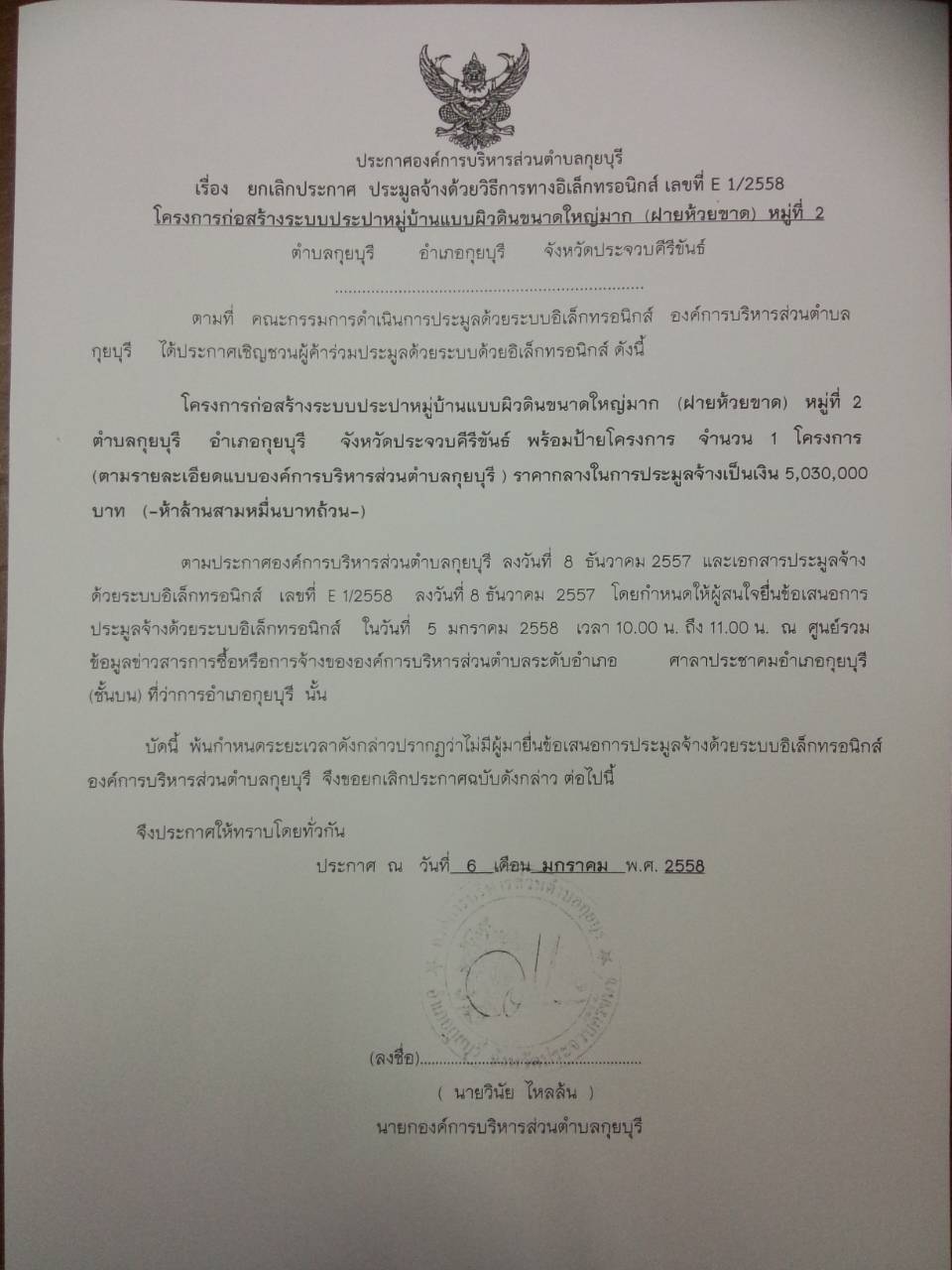 ประกาศยกเลิกโครงการก่อสร้างระบบประปาหมู่บ้านแบบผิวดินขนาดใหญ่มาก(ฝายห้วยขาด)