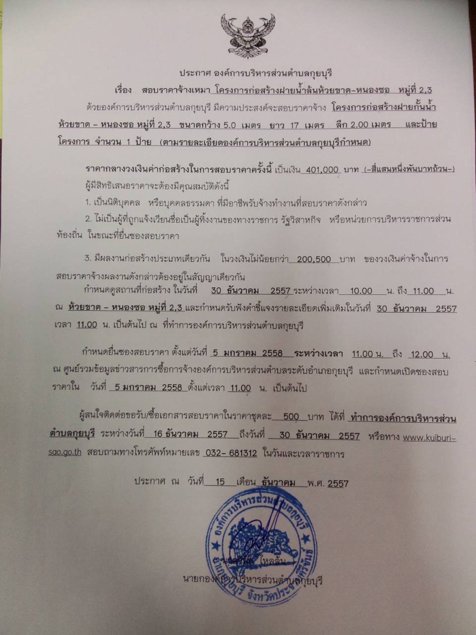 สอบราคาจ้างโครงการก่อสร้างฝายน้ำล้นห้วยขาด-หนองซอ หมู่ที่ 2,3
