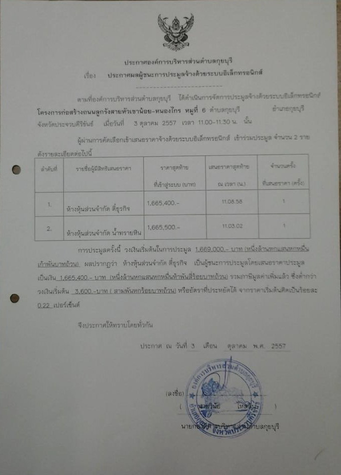 ผู้ชนะการประมูลจ้างด้วยระบบอิเล็กทรอนิกส์ โครงการก่อสร้างถนนลูกรังสายหัวเขาน้อย-หนองไกร หมู่ที่ 6