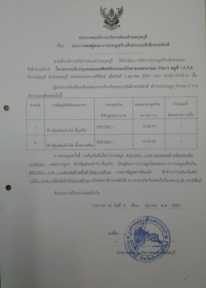 ผู้ชนะการประมูลจ้างโครงการปรับปรุงถนนแอสฟัลท์ติกคอนกรีตสายเพชรเกษม-วังยาว หมู่ที่ 1,2,5,8