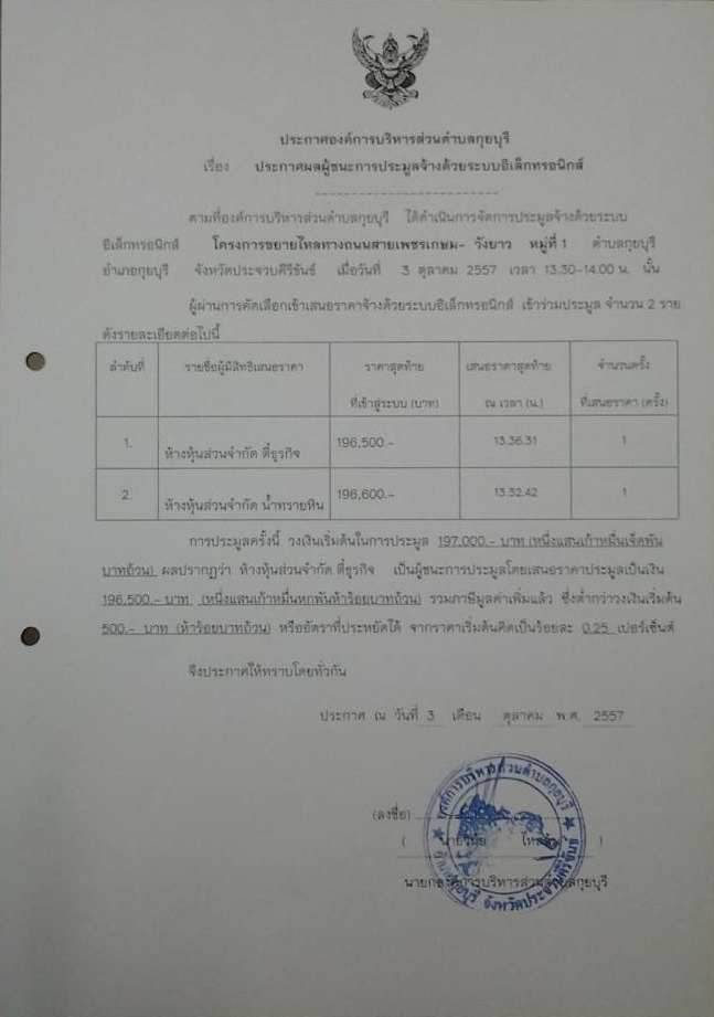 ประกาศผลผู้ชนะการประมูลจ้างด้วยระบบอิเล็กทรอนิกส์ โครงการขยายไหล่ทางถนนสายเพชรเกษม-วังยาว หมู่ที่ 1