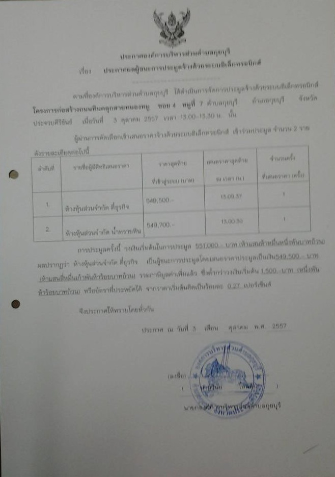 ประกาศผลผู้ชนะการประมูลจ้างด้วยระบบอิเล็กทรอนิกส์ โครงการก่อสร้างถนนหินคลุกสายหนองหยู ซอย 4 หมู่ที่ 7