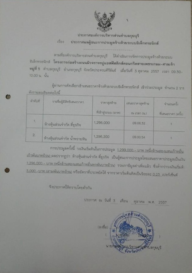 ประกาศผลผู้ชนะโครงการก่อสร้างถนนผิวจราจรปูแอลฟัสติกท์คอนกรีต สายเพชรเกษม-ศาลเจ้า หมู่ที่ 5
