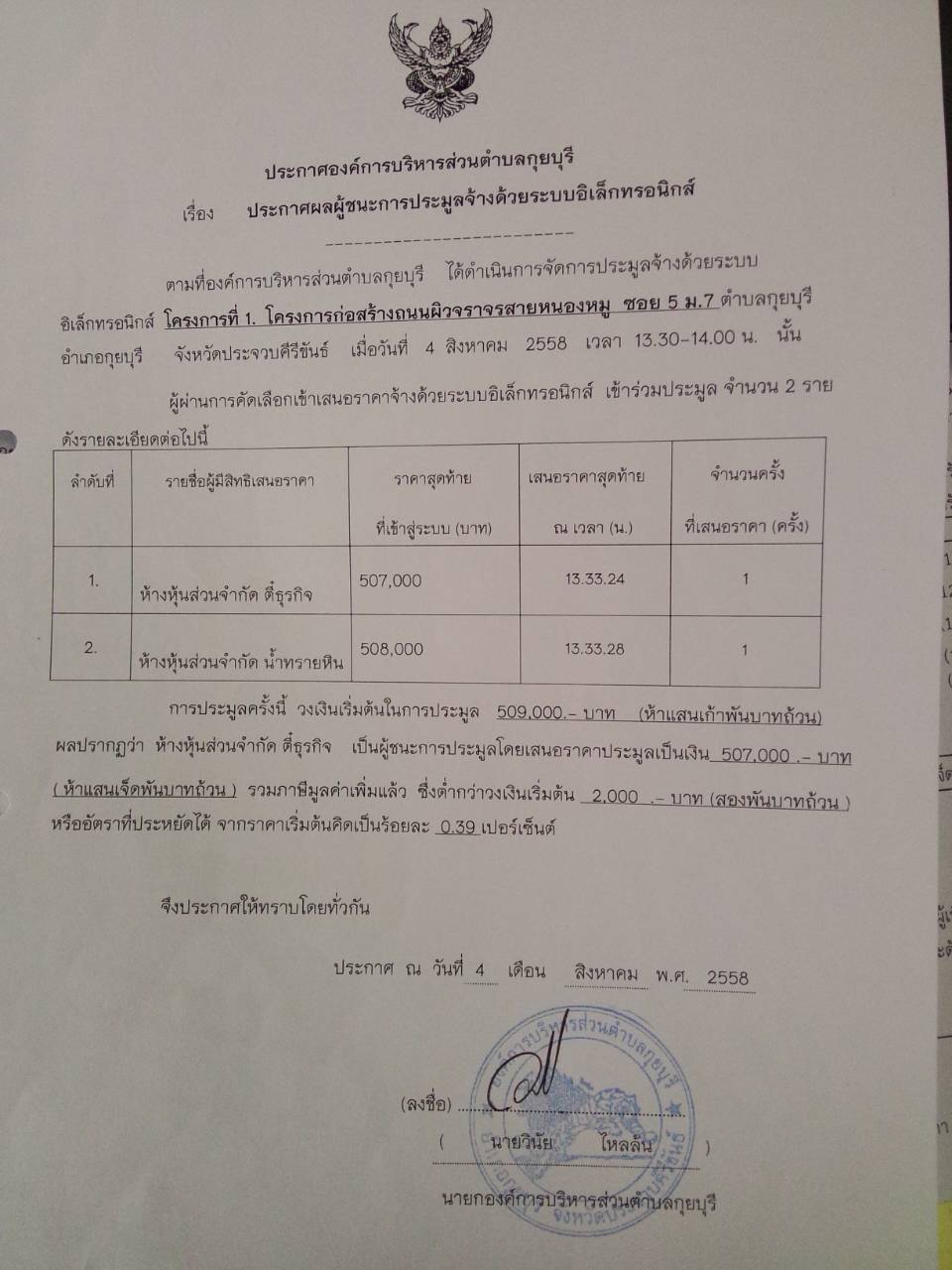 ประกาศผู้ชนะการประมูลจ้าง โครงการก่อสร้างถนนผิวจราจรสายหนองหมู ซอย 5 หมู่ที่ 7