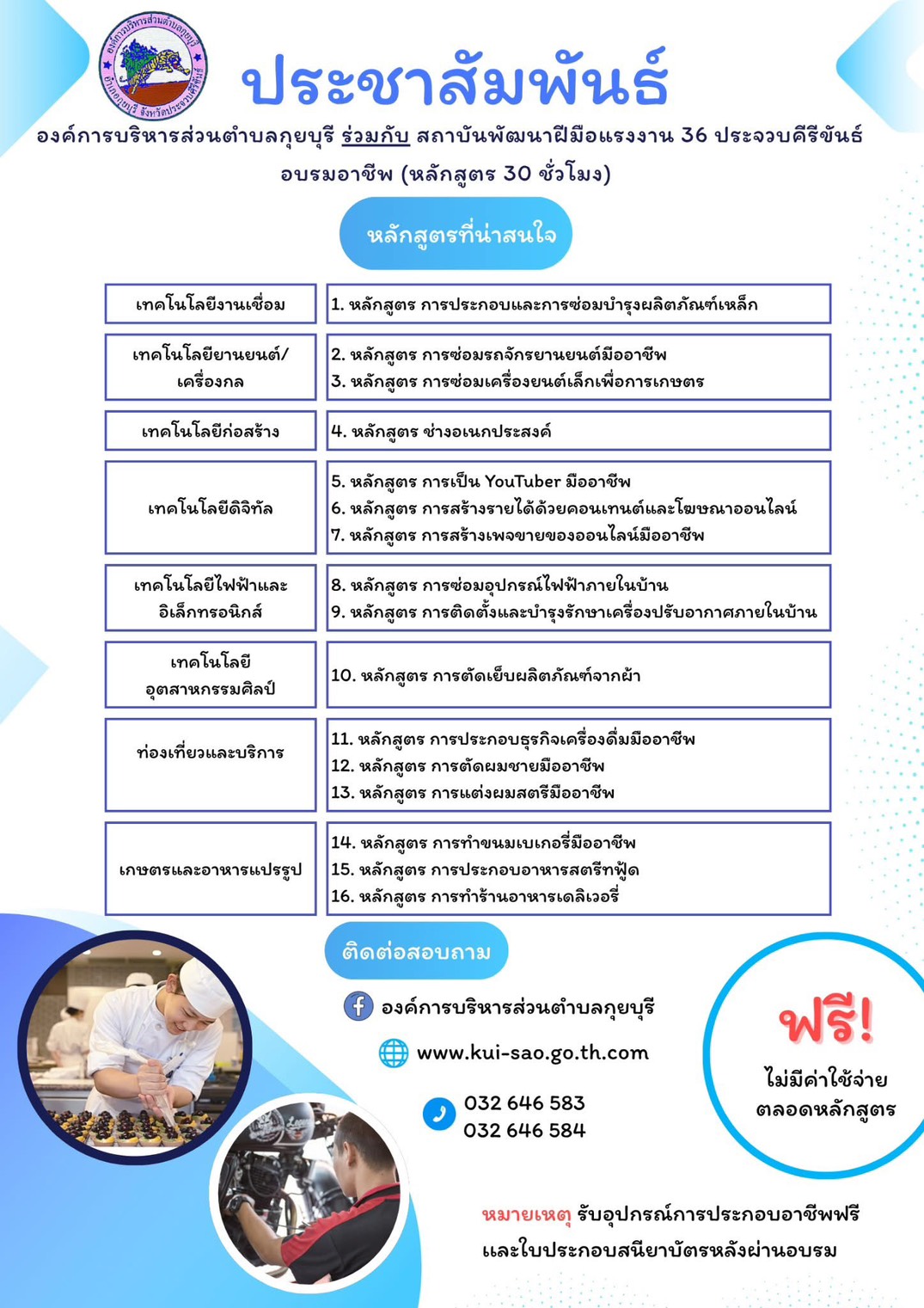 ประชาสัมพันธ์ องค์การบริหารส่วนตำบลกุยบุรี ร่วมกับ สถาบันพัฒนาฝีมือแรงงาน 36 ประจวบคีรีขันธ์ อบรมอาชีพ (หลักสูตร 30 ชั่วโมง)