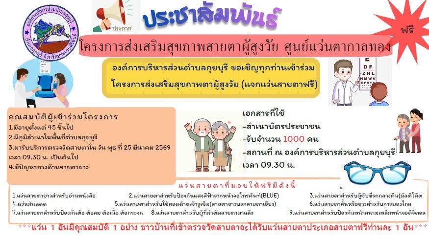 ประชาสัมพันธ์ จาก องค์การบริหารส่วนตำบลกุยบุรี องค์การบริหารส่วนตำบลกุยบุรี ขอเชิญทุกท่านเข้าร่วม โครงการส่งเสริมสุขภาพสายตาผู้สูงวัย(แจกแว่นสายตาฟรี) ณ องค์การบริหารส่วนตำบลกุยบุรี ในวันพุธที่ 25 มีนาคม 2569 เวลา 09.30 น. เป็นต้นไป
